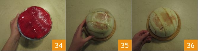 Cover with plastic wrap and refrigerate for at least three hours. After this time, turn it over on a plate 35 and remove the bowl 36.