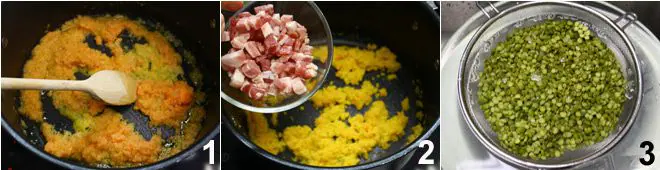 To prepare split pea soup, start by soaking the split peas in plenty of cold water and leave them for at least 3 hours. Finely chop the carrot, celery, and onion and sauté them with the garlic in extra virgin olive oil in a large pot 1. Sauté for about 10 minutes and then add the diced bacon 2 (if you prefer, you can add the bacon in one slice) and let it brown well. Rinse the peas well under cold running water 3.