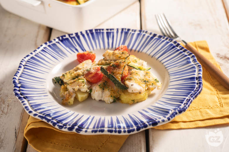 Lightly oil a baking dish. Arrange the potato slices on the bottom, then layer the cooked sea bass, zucchini strips, and halved cherry tomatoes.