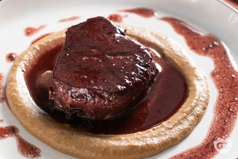 Serve the beef tenderloin over the cauliflower and porcini cream, finishing with the Amarone wine sauce.