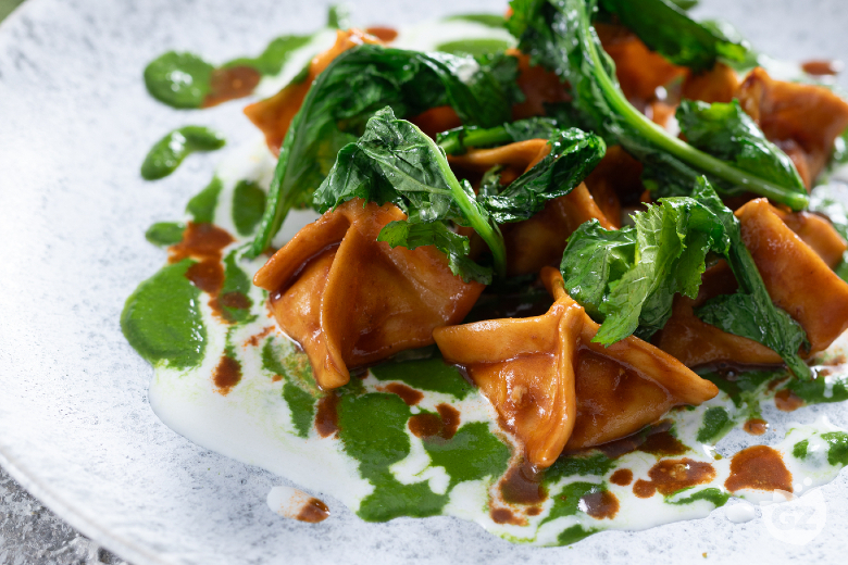 Plate by placing the broccoli rabe sauce on the plate, add stracciatella, the ravioli bundles, the cooking liquid, and the previously sautéed broccoli rabe.